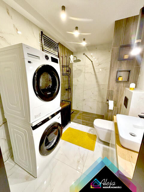 Łazienka z wc,prysznicem,pralką,suszarką,szafkami.