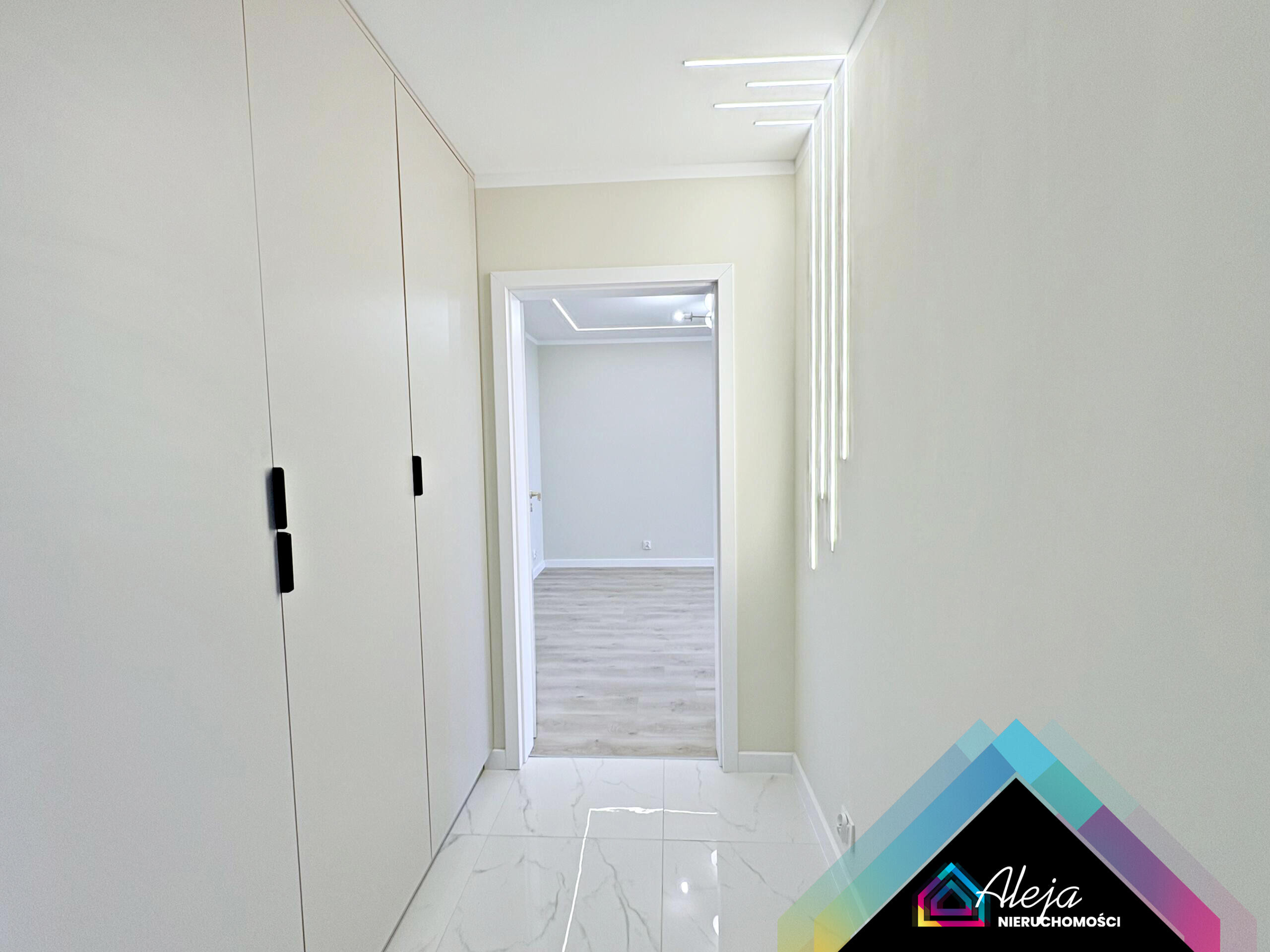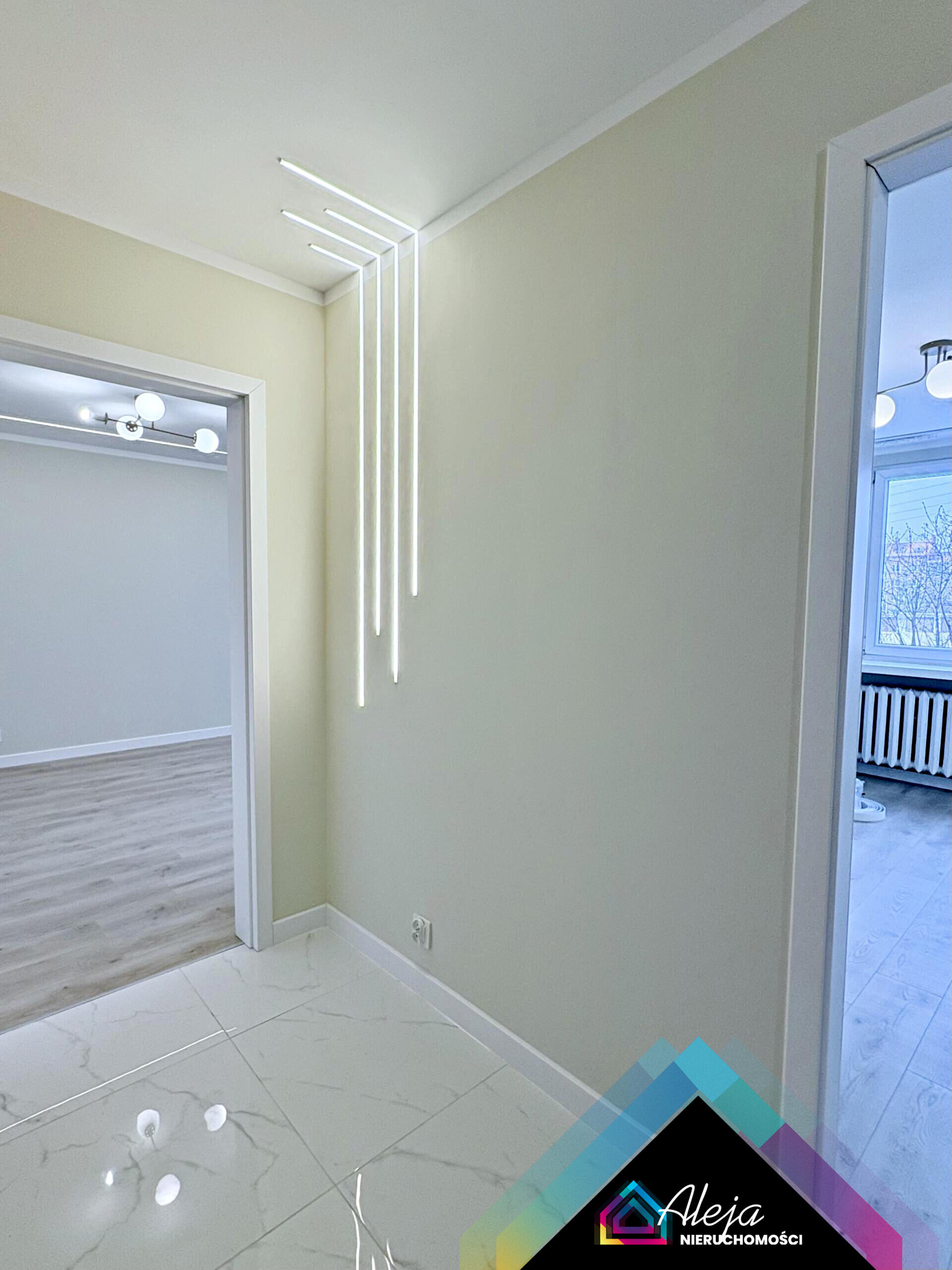 Wnętrze utrzymane jest w jasnych, eleganckich odcieniach, które optycznie powiększają przestrzeń i nadają jej nowoczesnego charakteru. Wyjątkowe, starannie zaprojektowane oświetlenie tworzy przytulny klimat i podkreśla styl mieszkania.