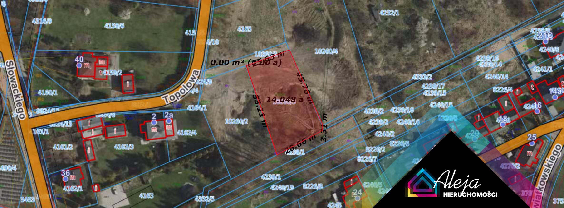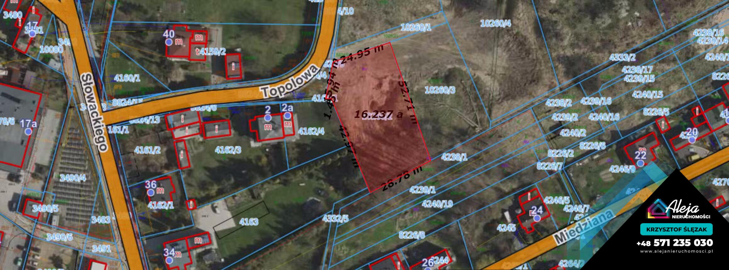 Jest to nieruchomość o powierzchni 1624 m2 szerokości 29 m a długości 55 m